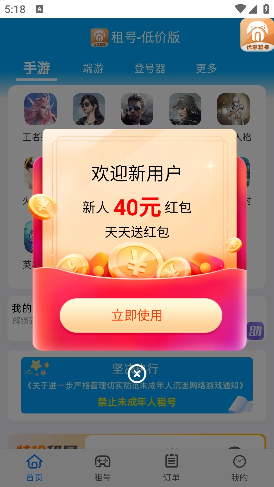 免费租号App是一款游戏账号租借应用,平台汇聚了大量优质游戏账号资源,涵盖王者荣耀、和平精英、火影忍者、蛋仔派对等热门游戏,玩家只需支付低价就能租到心仪的精品账号。租号成功后支持一键登录,若登录过程中遇到任何问题,可随时联系24小时在线客服咨询,保障每一笔交易顺利完成。此外,免费租号App还为玩家准备了丰富福利:新人注册即赠福利折扣券与红包,老玩家每日也能领取租号优惠红包。喜欢玩游戏的朋友们千万不要错过,快来本站免费体验吧!