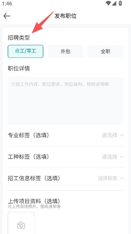 招聘类型划分细致明确,点工、外包、全职等类别区分清晰,能够适配不同的用工需求与就业模式。