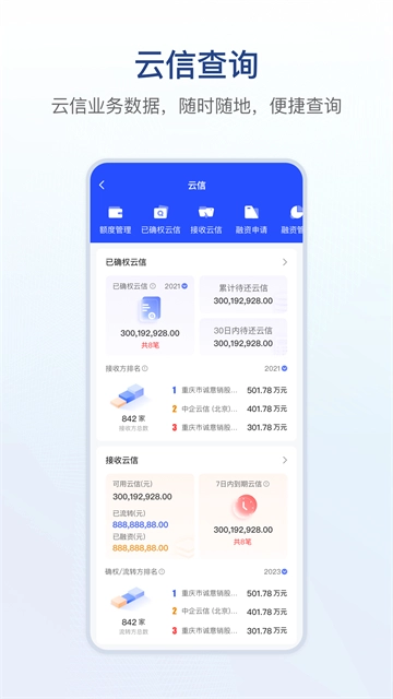 云信业务与明细、融资申请及进展,通过多维度可视化方式清晰呈现