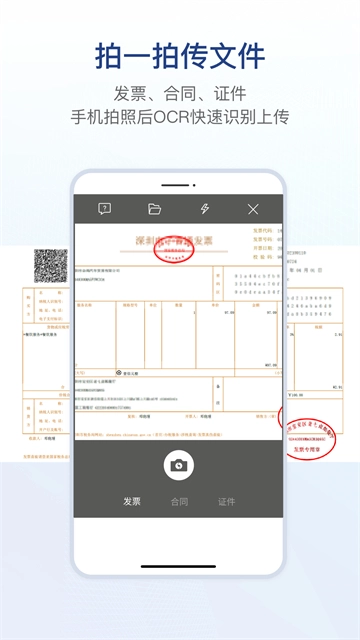 【拍一拍】用手机拍摄发票、合同、证件等文件,借助OCR技术快速识别内容后,直接上传至企业云文件存储平台。