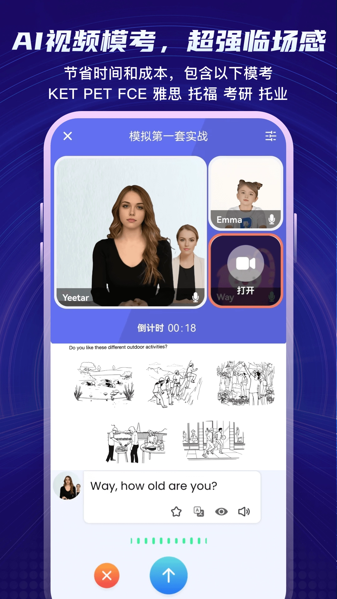 适用于考研、托福、雅思等各类应试口语考试的考前实战模拟,能带来真实的临场体验。