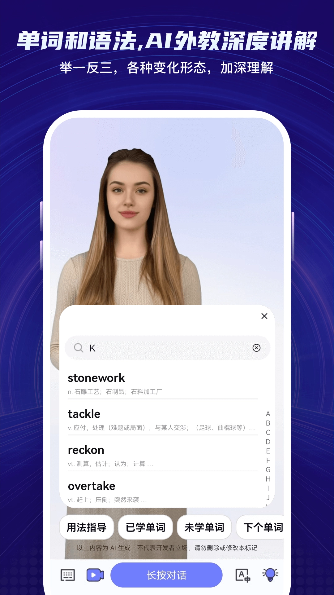 借助倚塔AI机器人,你能够打造专属的英语数字人,无论何时何地都能开展口语训练与陪练。依托最新的语音识别技术和语法纠正技术,数字外教“倚塔”不仅能精准领会你的表达意图,对你所说的任何内容都能做出回应,还能实时提供发音及语法方面的反馈。