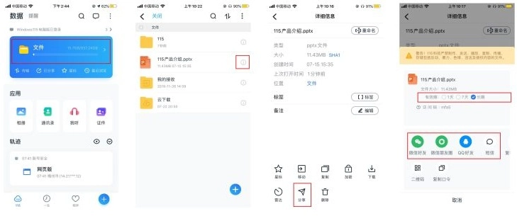 ①「大众分享」:115的所有注册用户都能进行文件分享操作,用户可将文件分享给微信、QQ等不同平台的好友。