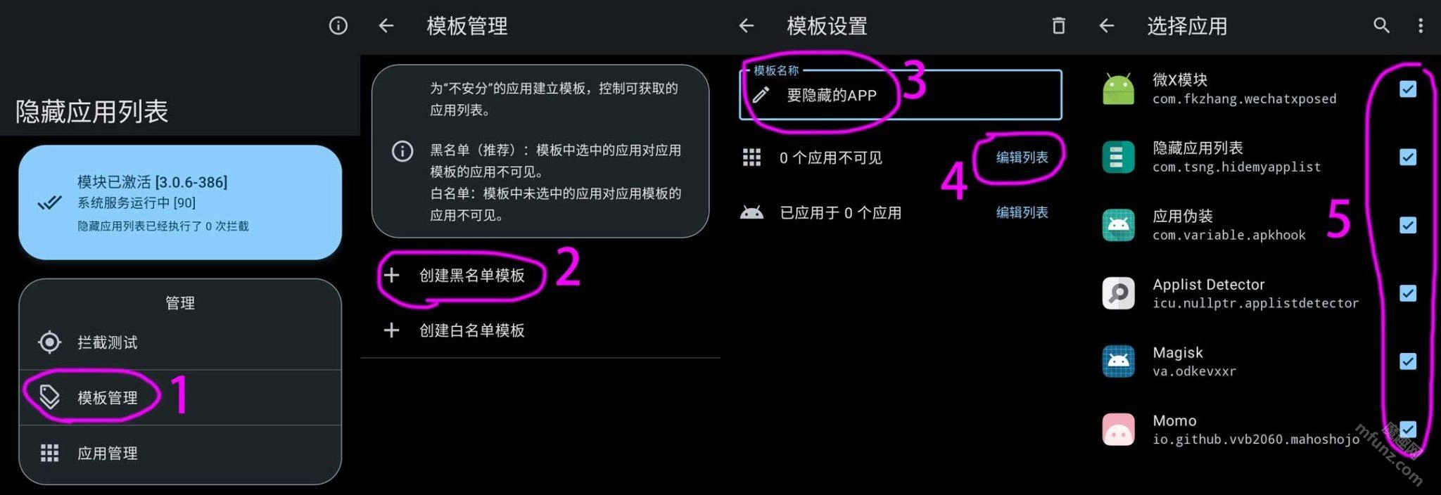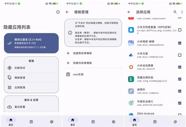 打开隐藏应用列表的操作步骤如下:首先进入模板管理界面,创建一个黑名单模板(模板名称可自行设定);接着进入编辑列表页面,将需要隐藏的应用(例如ROOT、模块类应用)全部勾选上。