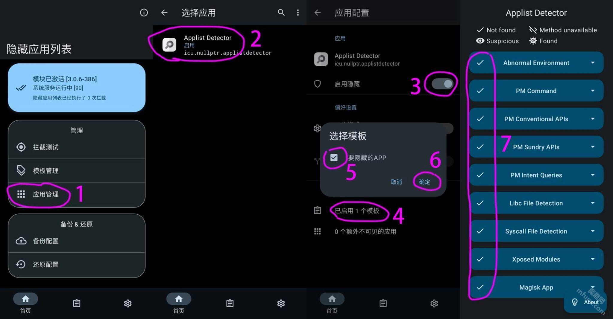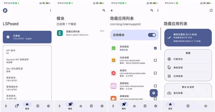 打开隐藏应用列表,进入应用管理,选择需要隐藏的应用,勾选启用隐藏的模板后点击确定,接着打开ApplistDetector检测器,检查应用是否已经成功隐藏。
