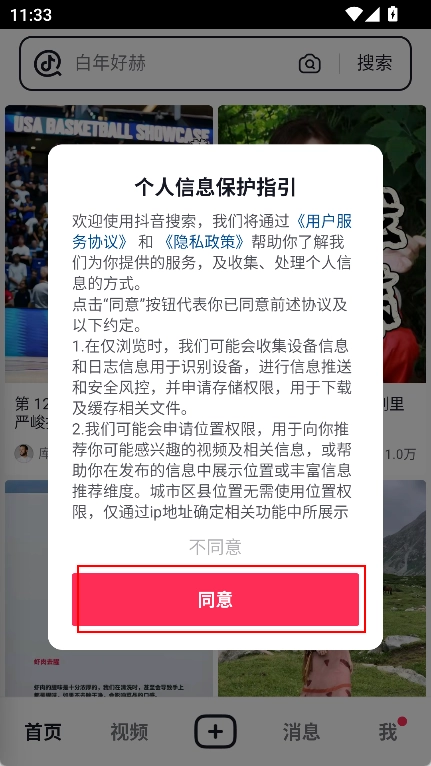 第一次打开抖音进行搜索时,会弹出个人信息保护指引,直接点击“同意”按钮就可以了。