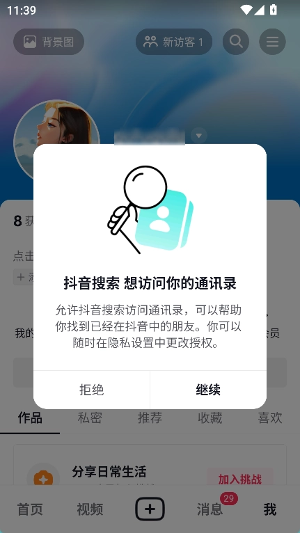 登录成功后,抖音搜索会弹出请求访问通讯录的提示,你可以根据自己的需求来决定是否允许。要是希望抖音为你推荐通讯录里的好友,直接选择继续就可以了。