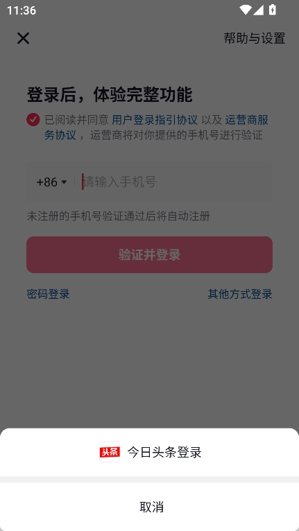 目前登录方式仅支持手机号和今日头条两种。其中手机号登录可直接操作:输入手机号码后,点击“验证登录”按钮即可完成登录。