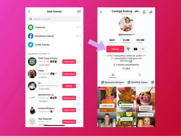 在TikTok上添加并关注相应账户,这样他们发布的视频就会展示在你的关注动态流里。
