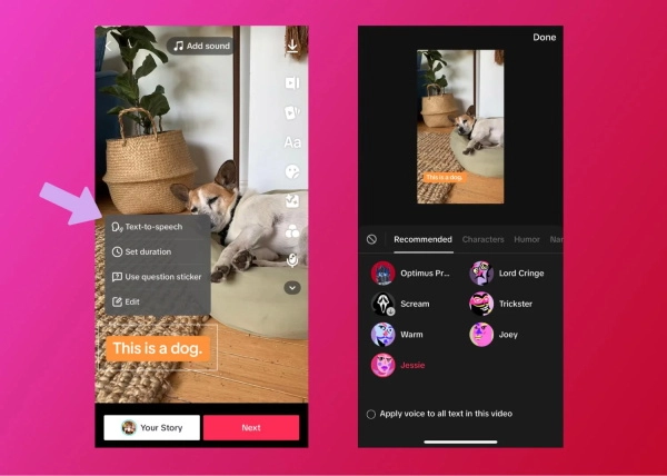 ● 文本转语音。TikTok的文本转语音功能十分受欢迎,能帮你在TikTok视频里添加语音内容,不用你亲自出声录制。