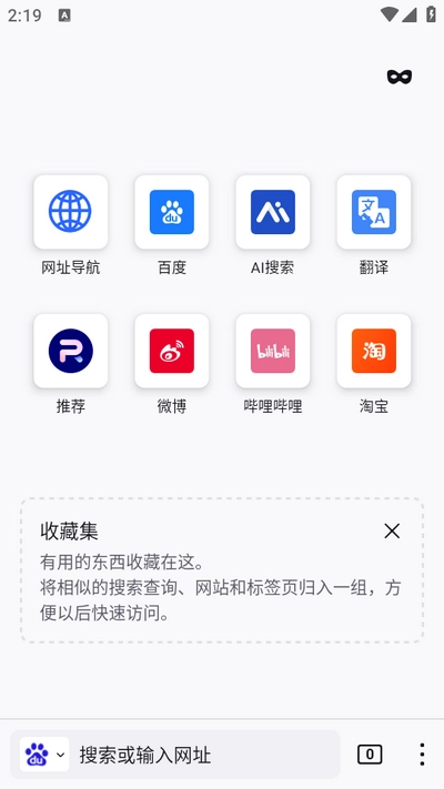进入首页后,能看到百度、微博、B站等各类网址入口。要是没有你需要的网址,还可以在页面底部输入你想查找的网址。