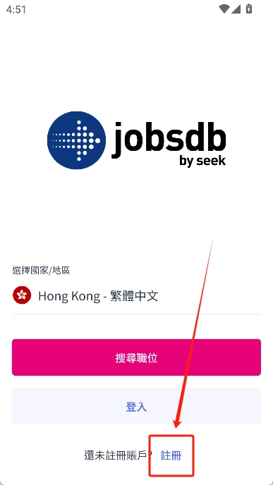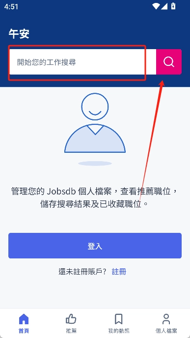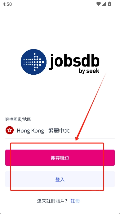 首先前往魔趣网下载并安装jobsdb应用,打开后你既可以选择“登录”已有账号,也能直接点击“搜寻职位”开始查找。