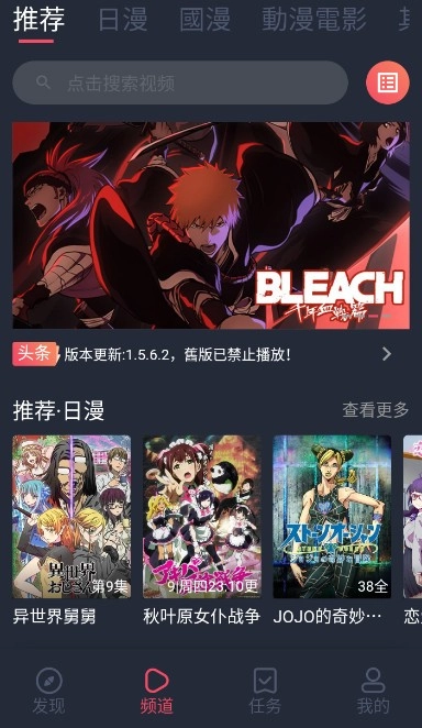 然后点击下方的“频道”,就能看到最新推荐的动漫内容。