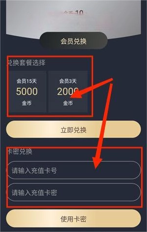 在我的会员界面可以用金币兑换会员,也可以用卡密兑换会员。