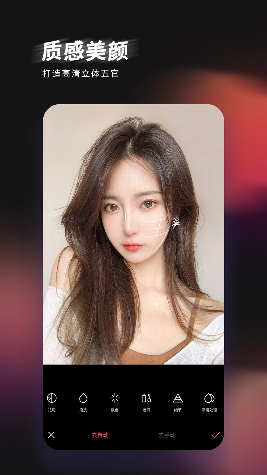 [去除皱纹]支持自动识别并去除皱纹,也可手动操作来去除皱纹。
