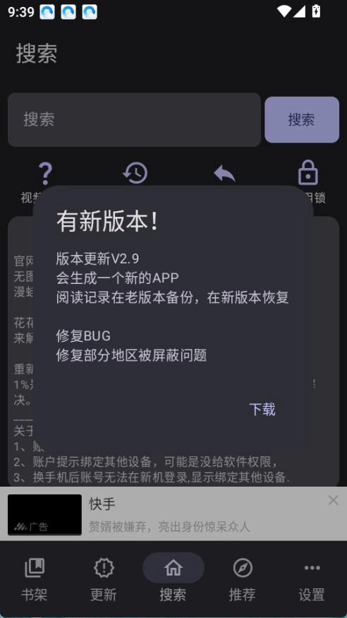 繁花漫画2.9版本安装包的实际版本号为0.2.9。当使用低于0.2.9版本的繁花漫画时,会弹出新版本更新提示,且提示显示的版本为2.9。若进行更新,无需卸载旧版本,更新至V2.9版本后,手机桌面会出现新的繁花漫画图标,同时生成新的阅读记录。老版本的备份可在新版本中恢复。此外,繁花漫画2.9版本新增了再漫画、漫蛙2等多个热门漫画源。