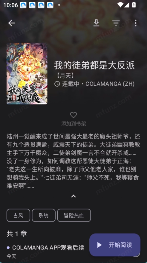 在漫画详情页面点击“开始阅读”按钮,即可进入阅读界面,之后通过左右滑动屏幕的方式就能切换到不同的章节。