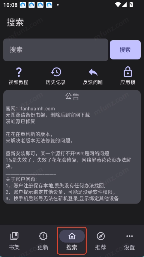 点击底部导航栏中位于“更新”和“推荐”之间的搜索按钮,就能打开搜索界面。
