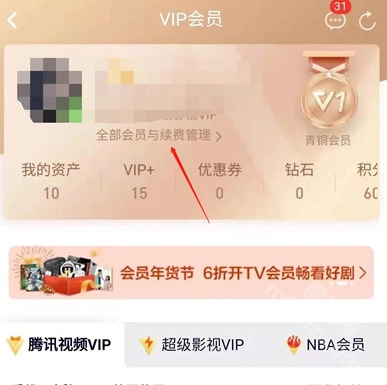 打开腾讯视频后进入“个人中心”,接着在VIP页面里找到并选择【所有会员及续费管理】选项。