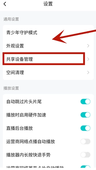 在设置菜单中,选择【共享设备管理】并点击进入。