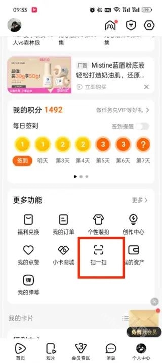 接下来,进入个人中心页面后,向上滑动屏幕直至页面底部,在更多功能列表区域就能找到【扫一扫】功能。