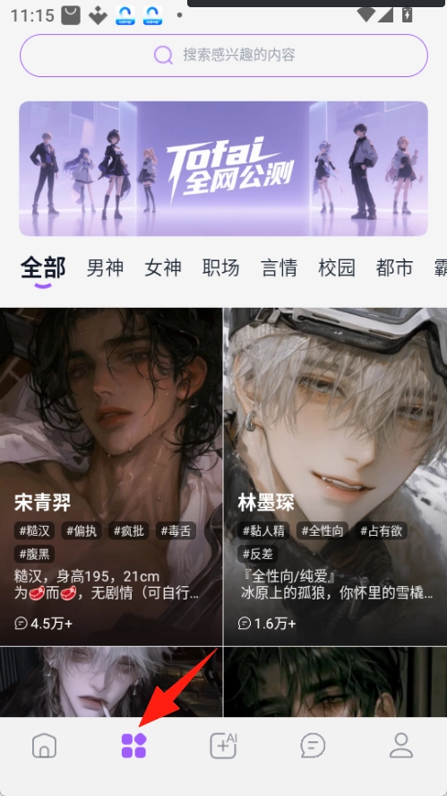 打开并登录Tofai App,接着点击底部的第二个图标进入角色广场。