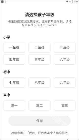 在开始使用软件前,请先完成注册与登录操作,随后选择孩子对应的年级。