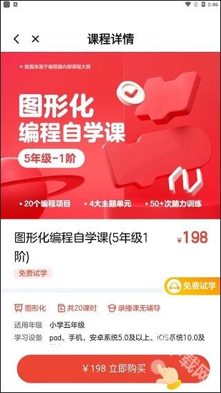 在“自学课程”板块设有免费试学入口,进入该页面后,你可以查看课程的详细介绍,浏览课程列表,了解课程支持的学习设备类型以及适用的年级范围。