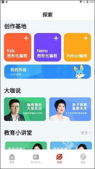 选好年级后,就能正式使用软件了。不得不说,软件的界面UI设计相当美观,首页不仅展示了优秀学员的作品,还提供了对应的课程选择,下方则呈现了师资教研的实力以及合作伙伴的相关信息。