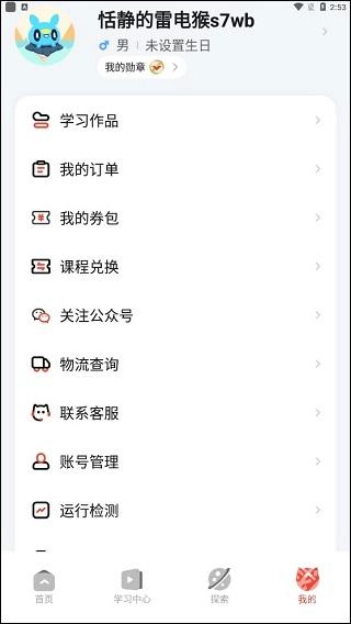 在“我的”页面(即个人中心),你可以进行学习作品的创建与课程管理操作,同时还能找到我的订单、我的券包以及课程兑换等优惠福利相关功能;如果在使用过程中遇到任何问题,也可以通过该页面联系客服。