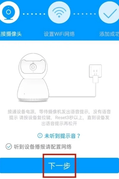 重置摄像头设备,待听到提示音响起后,点击“下一步”按钮,接着选择对应的网络并输入密码,即可完成连接操作。