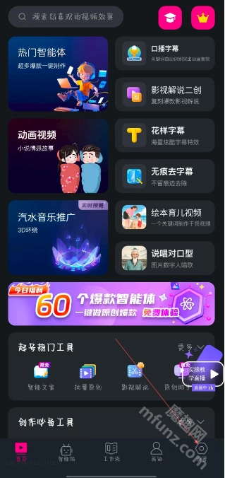 打开美册视频制作,进入首页,点击右下角设置图标。