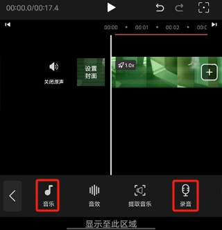 进入“音频”功能界面后,点击“音乐”选项就能给视频配上背景音乐,也可以选择“录音”功能来进行实时配音。