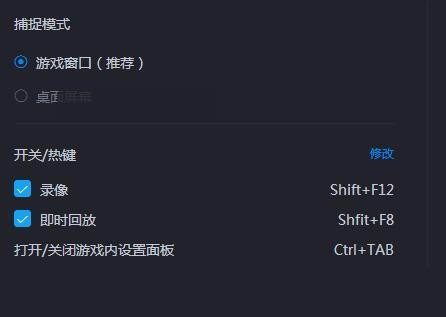 下拉界面还能选择需要捕捉的界面,也可以开启录像热键等功能。