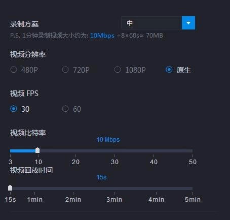 在右侧能够对录制方案、分辨率、FPS以及比特率等参数进行选择配置。