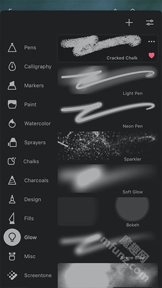 选择笔刷的操作:点击画笔图标就能完成选择;添加笔刷的方式:按下“+”键,既可以从社区获取分享的笔刷,也能够自行制作添加。