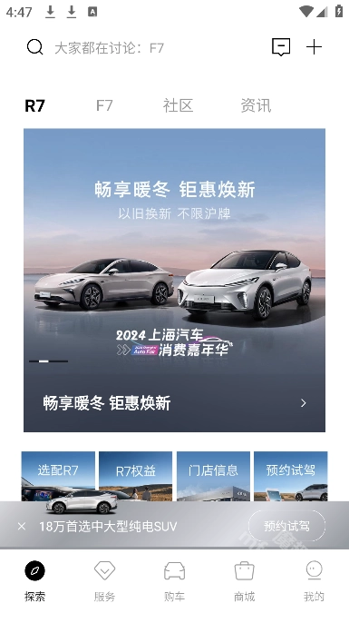 【探索】包含资讯、活动信息、社区论坛和积分商城。