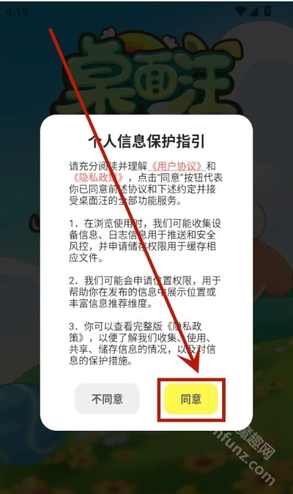接着安装桌面汪App,启动应用之后,点击【同意】按钮来接受隐私政策。