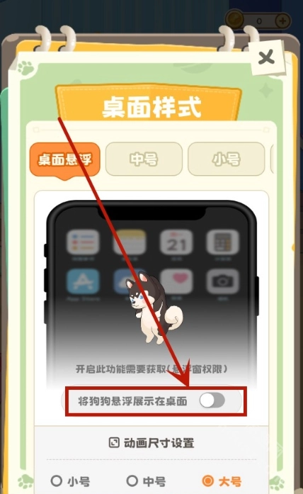 按照个人喜好挑选合适的尺寸,然后打开【把狗狗悬浮显示在桌面上】的选项。
