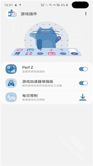 安装完成后,打开选择界面,会看到三个开关选项,分别是Perf Z、游戏加速器增强版以及每日限制。