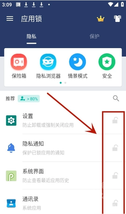 向下滑动屏幕,选中您想加密的应用,点击右侧的锁定按钮,就能立即为选定的应用开启锁屏保护。