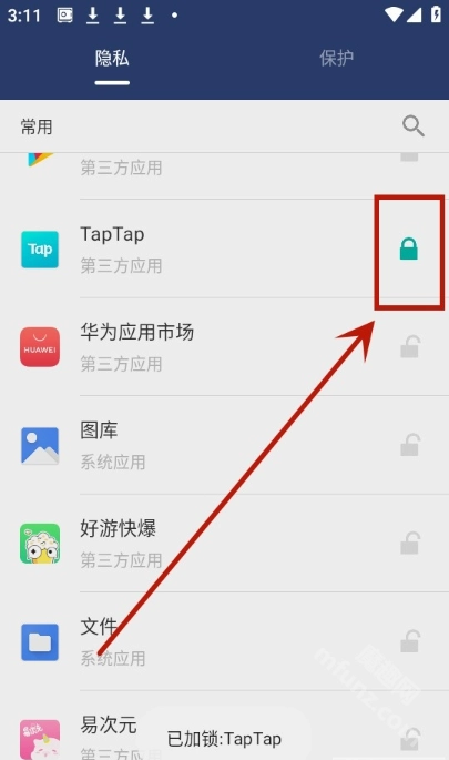 首先在魔趣网(m.mfunz.com)下载并安装应用锁lock的新版。