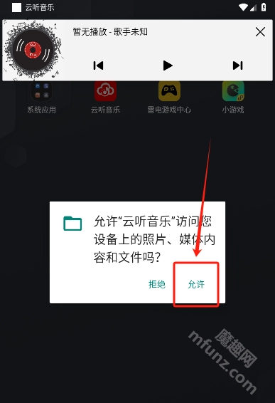首先前往魔趣网找到并安装云听音乐应用。进入软件时点击“允许”以授予所需的手机权限。