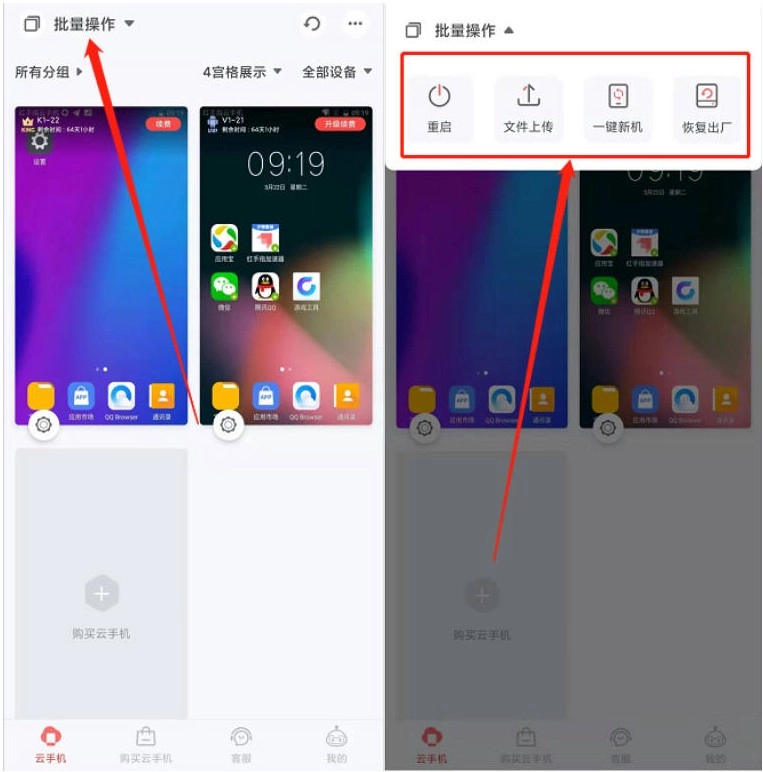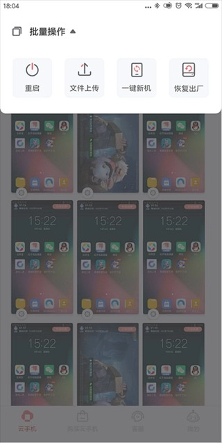 进入红手指专业版安卓应用后,点击主界面上的批量操作按钮,此时会呼出云手机批量管理功能,该功能涵盖了批量重启、文件上传、一键新机、恢复出厂设置等操作选项。