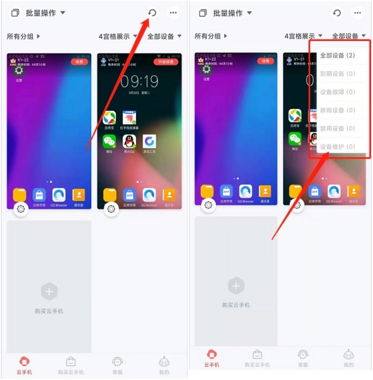 点击专业版主界面底部菜单栏的“购买云手机”选项,就能进入云手机的购买、续费与升级功能界面;点击对应的功能按钮,即可进行相关操作。