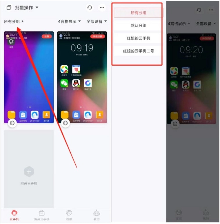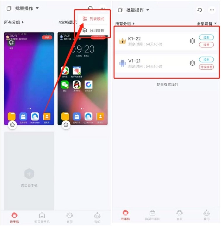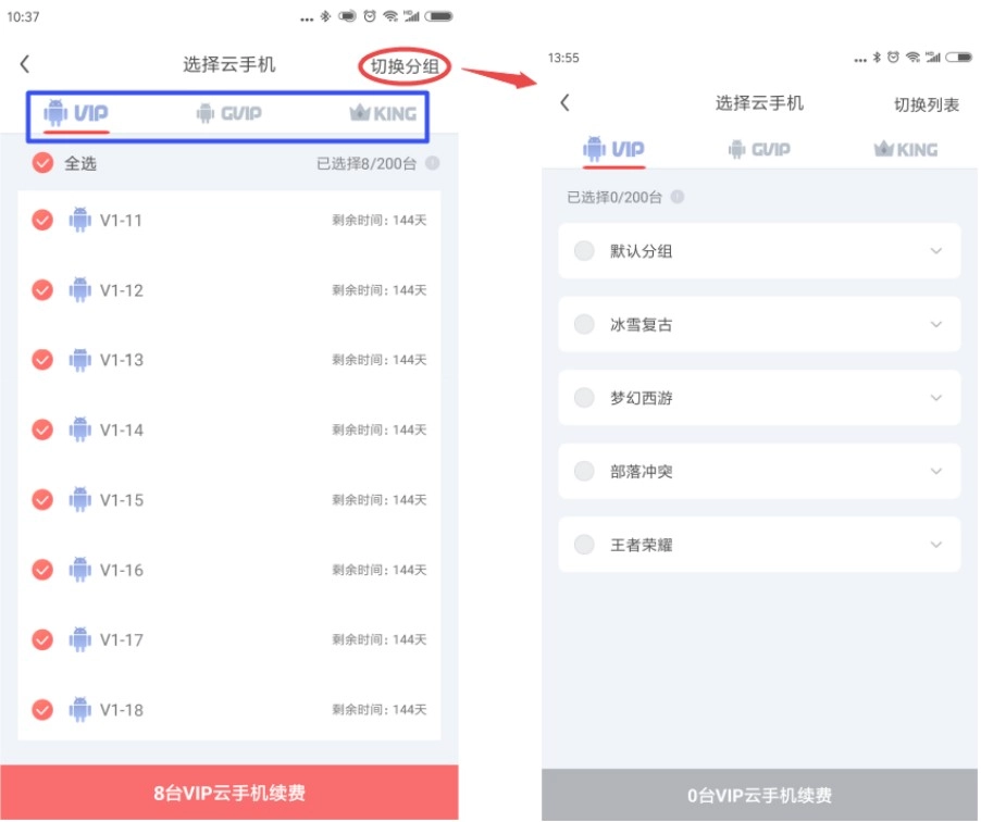 选择云手机时,既可以按照VIP、GVIP、KVIP这些不同的云手机类型来挑选;也能点击右上角的“切换分组”按钮,根据云手机的分组情况来进行批量续费的选择。