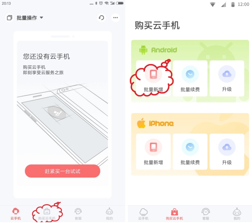 登录红手指专业版主页后,点击底部菜单栏的“购买云手机”选项,即可进入Android与iOS系统云手机的批量购买及续费功能页面。