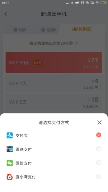 在购买云手机时,首先选择系统类别(Android/),接着在购买界面中选定云手机类型(VIP/GVIP/KVIP)以及对应的时长套餐。