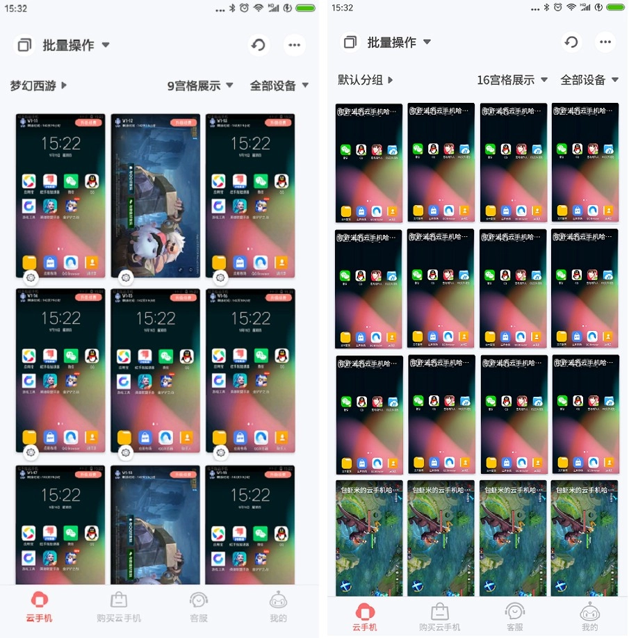 红手指专业版安卓端具备同屏监控多台云手机的功能,用户可在一个屏幕上同时预览多台云手机的托管状态,并且能够通过切换视图大小来调整显示的云手机数量,支持四宫格、九宫格和十六宫格这三种预览模式的切换。当处于四宫格或九宫格预览界面时,每个云手机的预览窗口会显示其名称,同时还提供单个云手机的升级续费以及单个设置操作选项;而在十六宫格预览模式下,仅会呈现云手机的预览画面。
