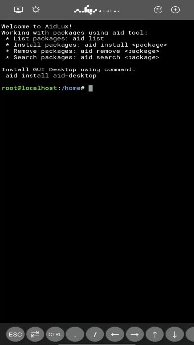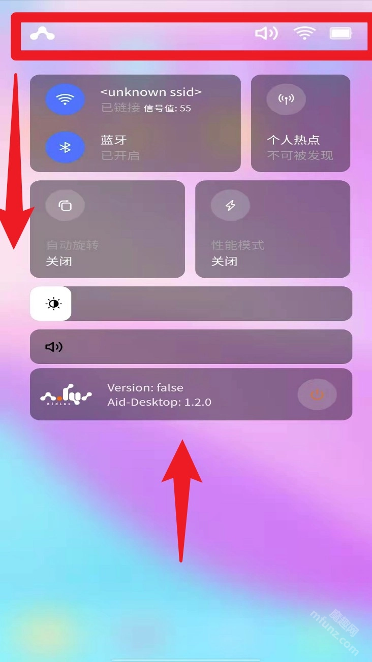 从屏幕顶部向下滑动,即可打开控制中心,在这里可以查看Wi-Fi、蓝牙等功能的状态,还能调节屏幕亮度和音量;屏幕底部则会显示Aid-Desktop的版本信息。